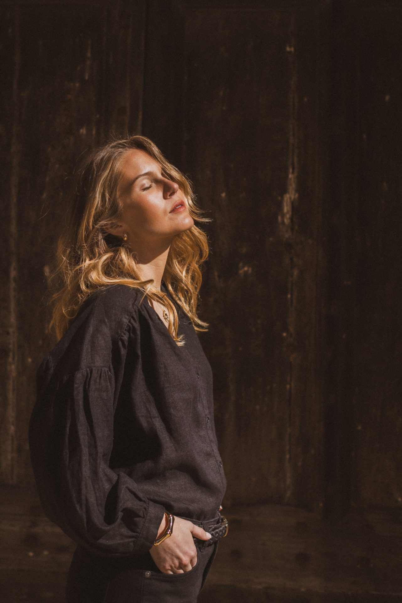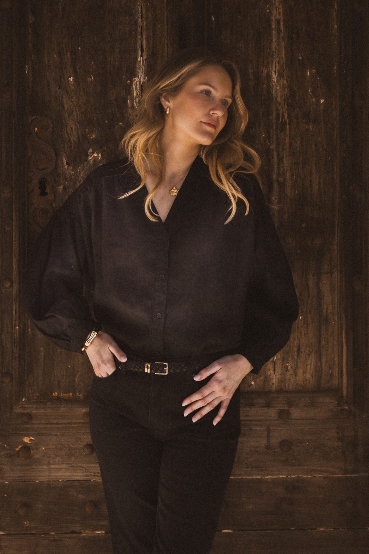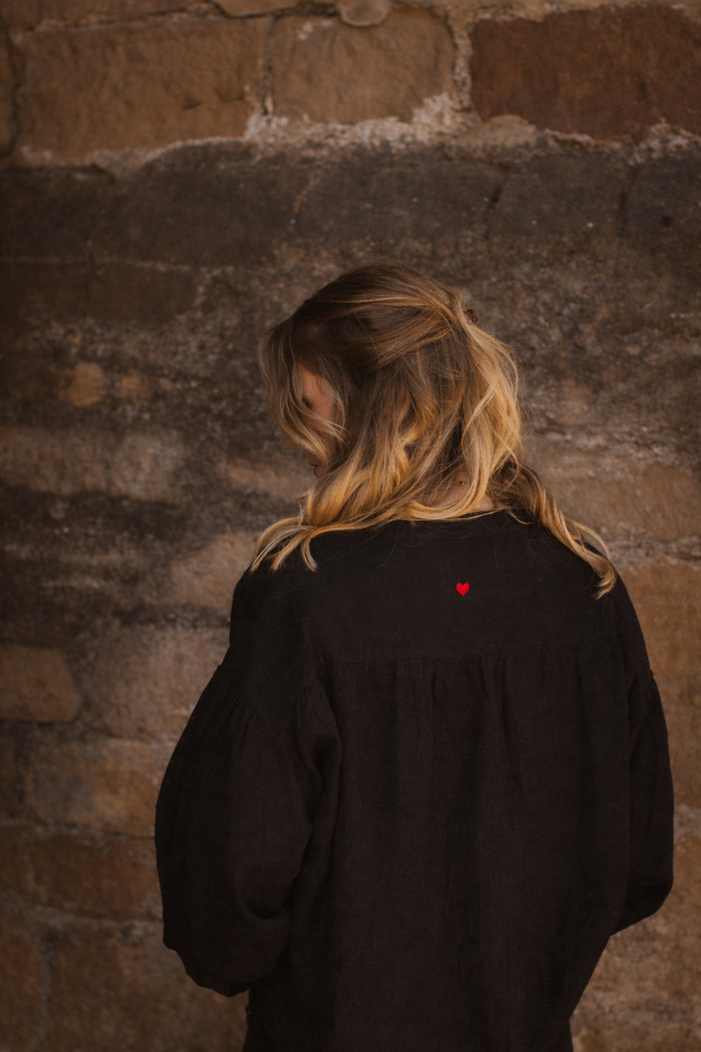 An airy, slightly oversized blouse with beautifully ruched shoulders that give a soft and feminine drape. V-neck and front buttoning with wide sleeves and cuffs.