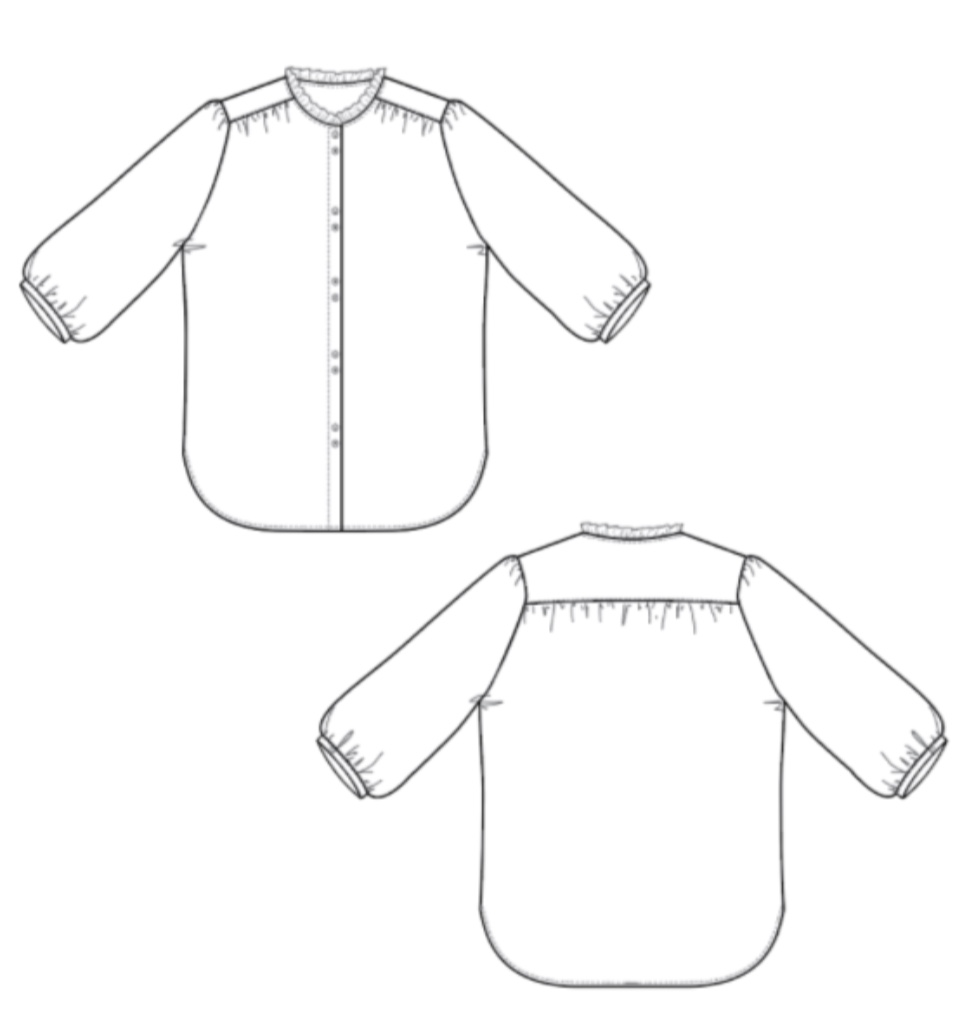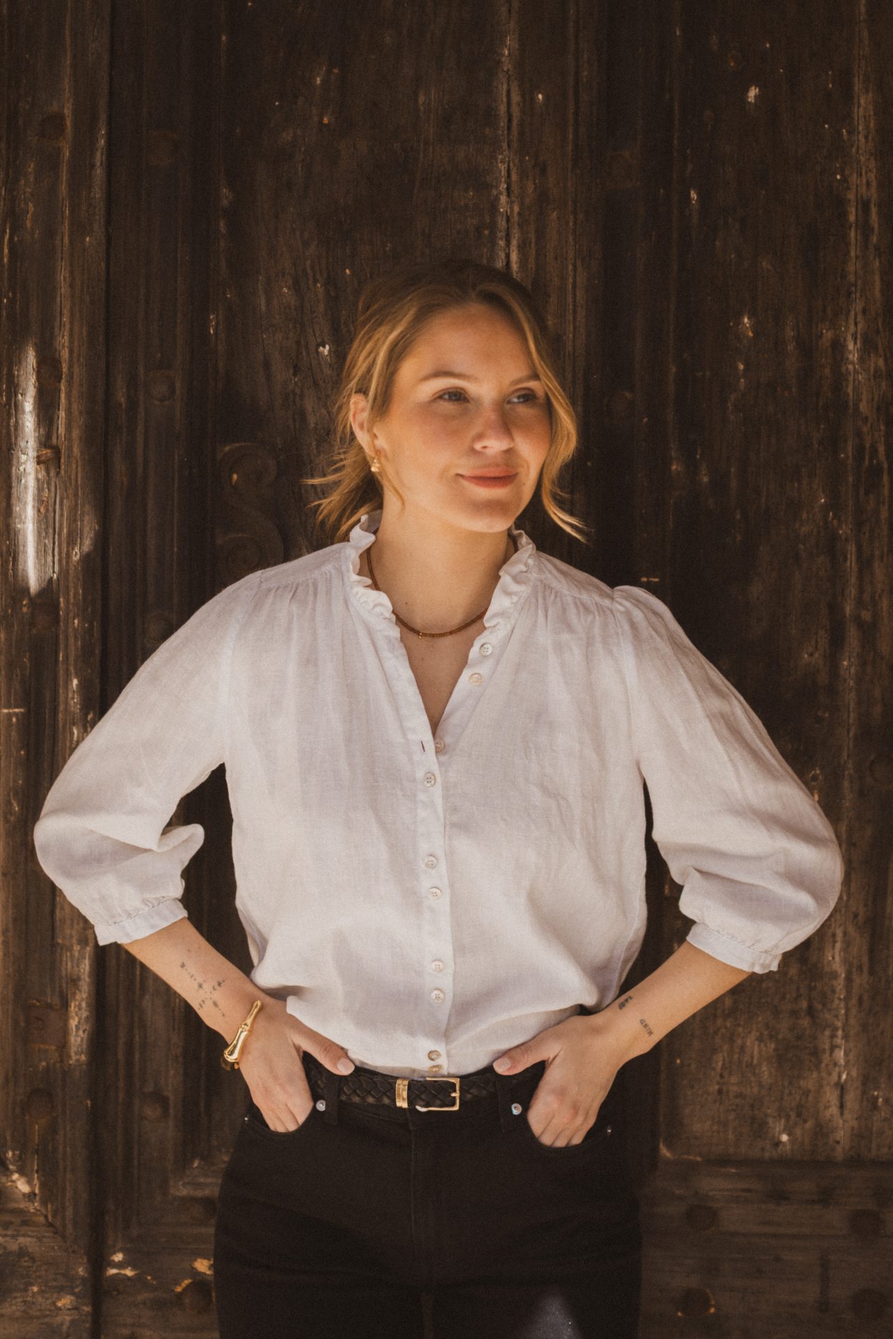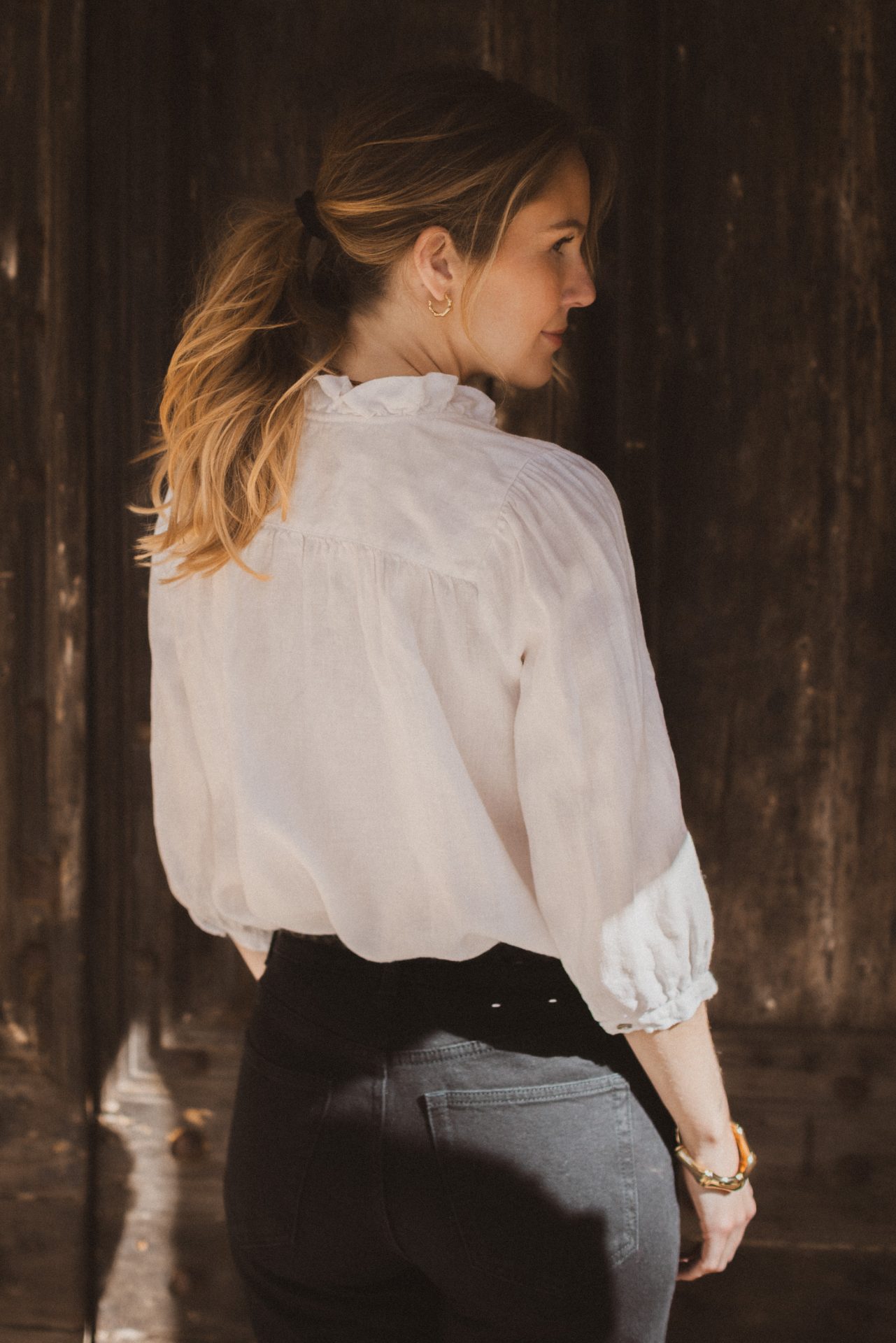 Linen blouse with a ruffled collar. Petite and well-tailored across the shoulders and sleeves; choose your usual size or size up.