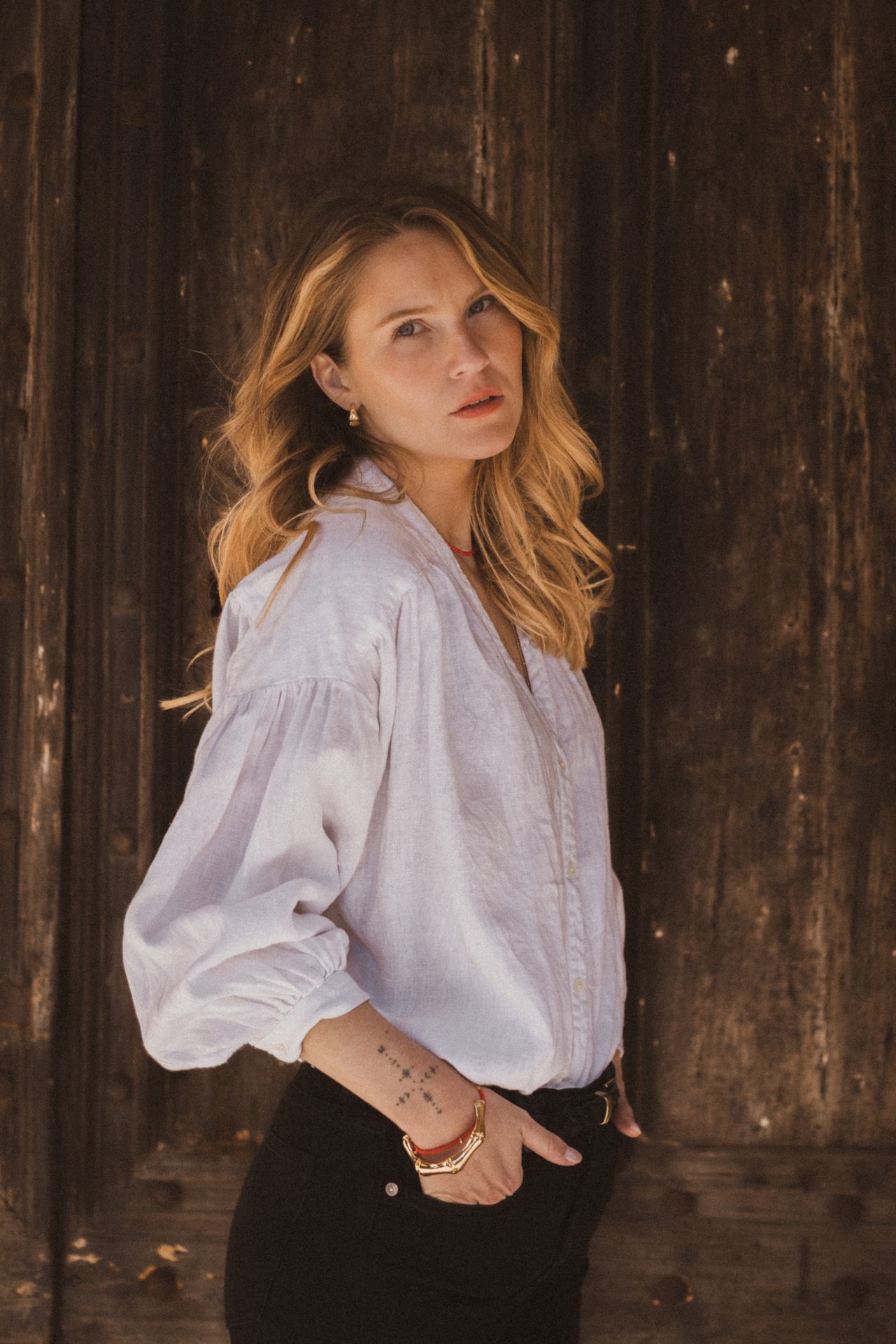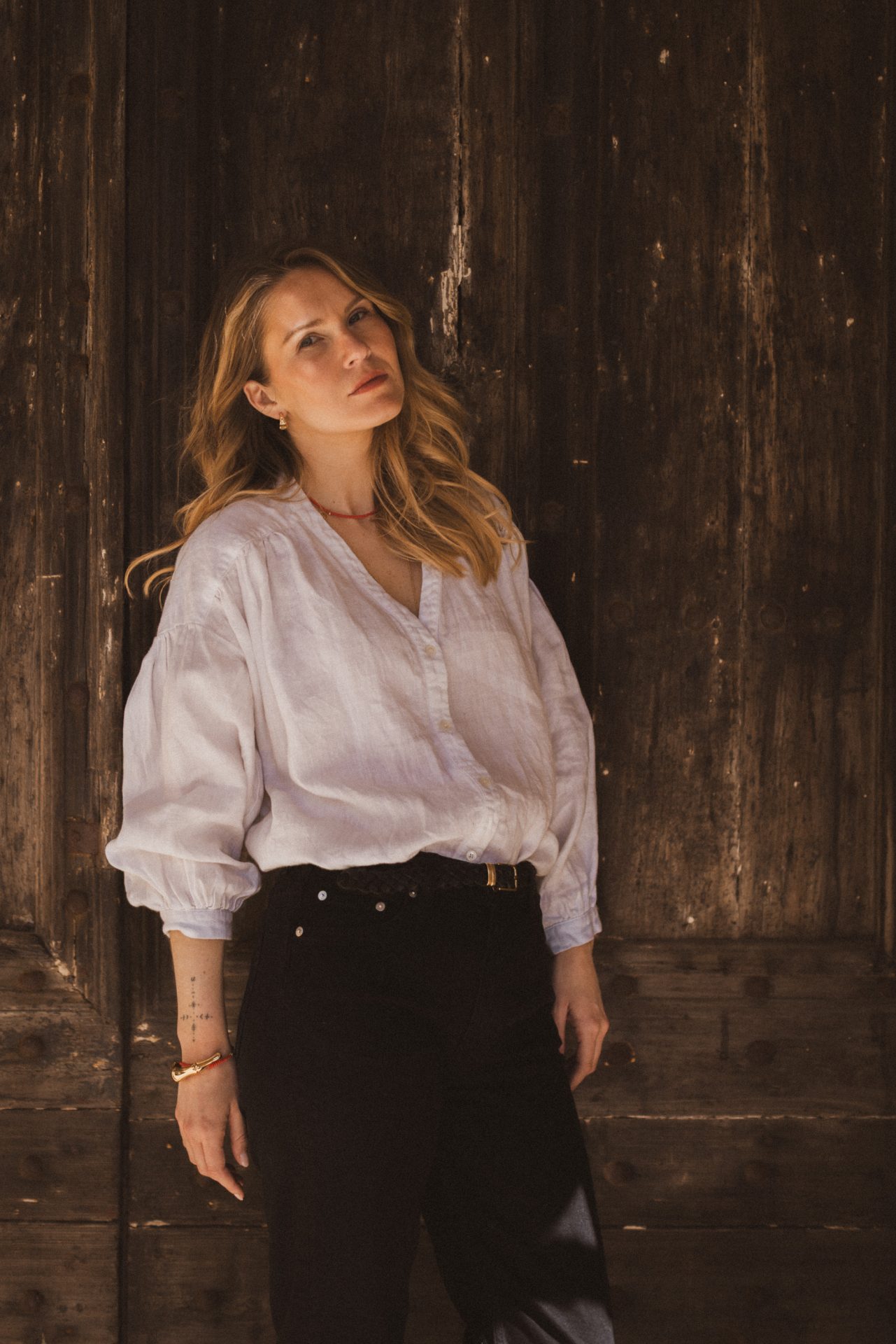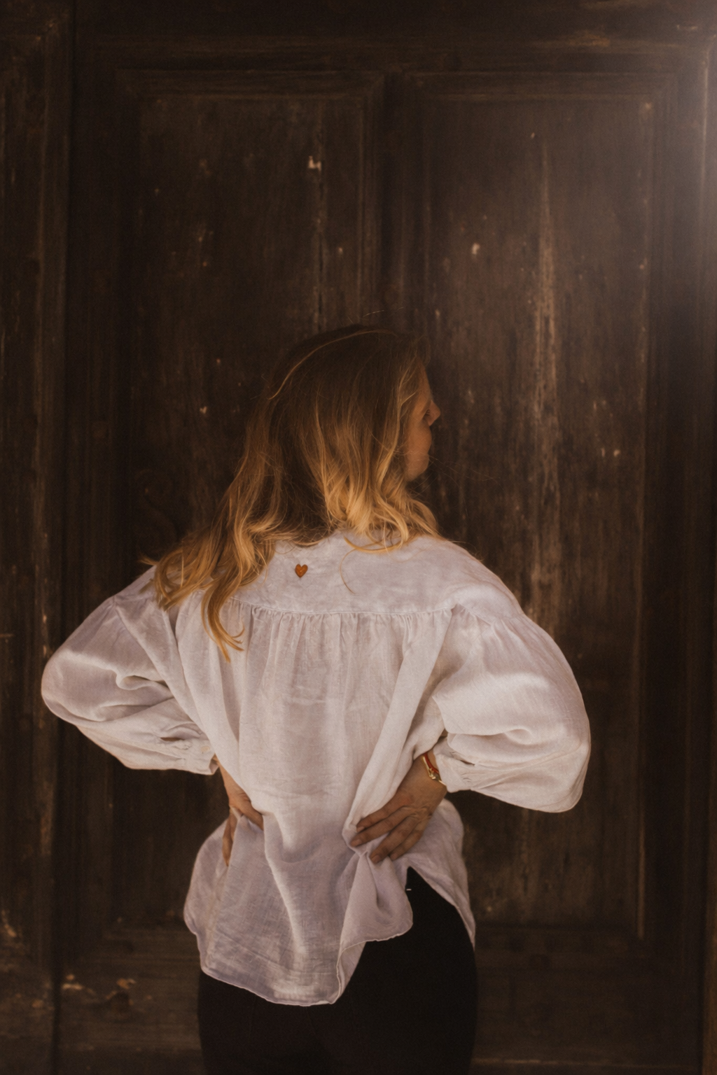 En luftig, lätt oversize blus med vackert rynkat axelparti som ger ett mjukt och kvinnligt fall. V-ringning och knäppning fram och vida ärmar med manschett. Broderat hjärta i nacken som en fin detalj.