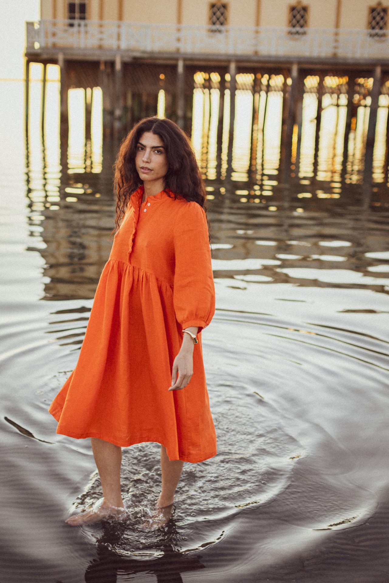 Klänning med vackert sydda detaljer och fickor i sidorna.