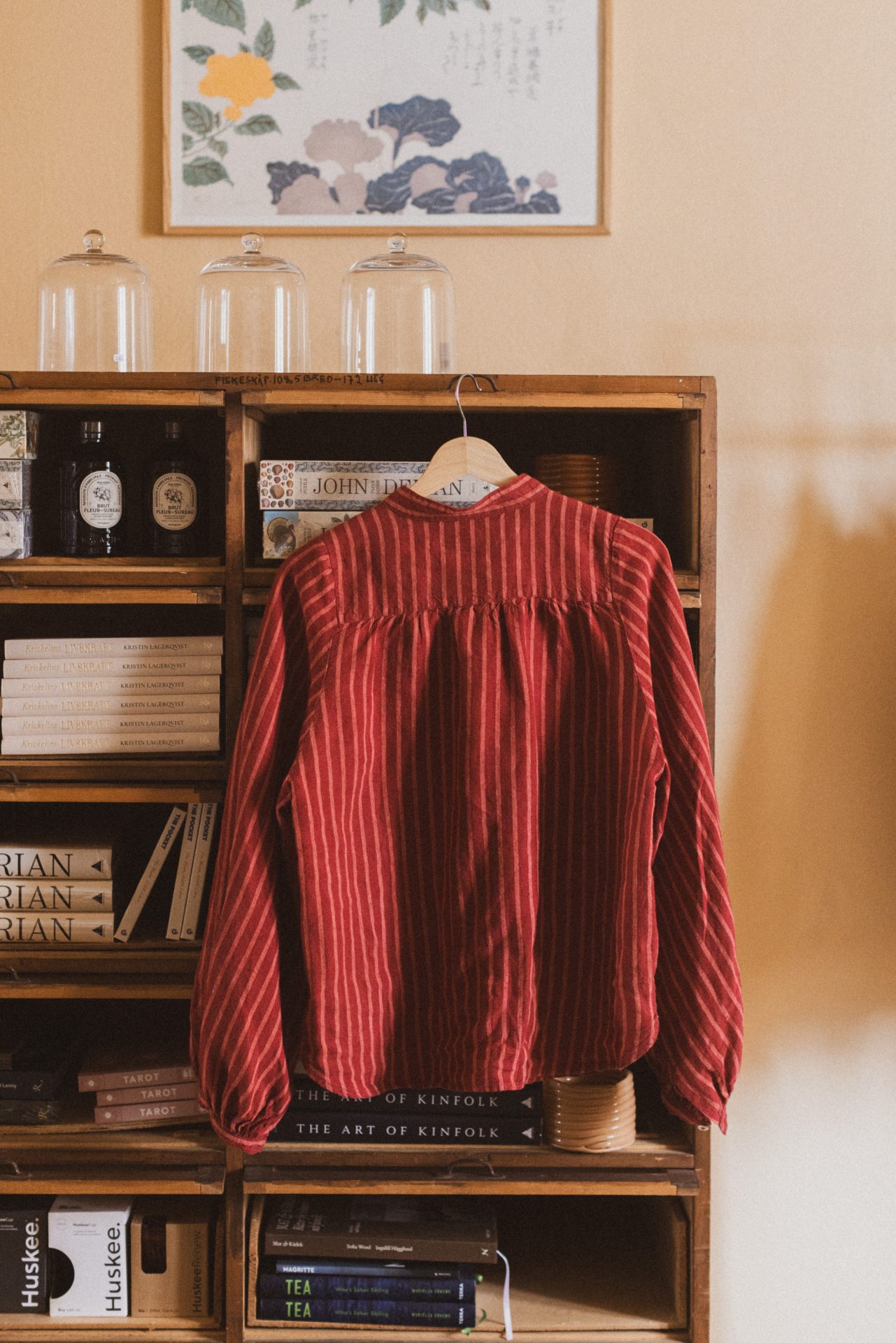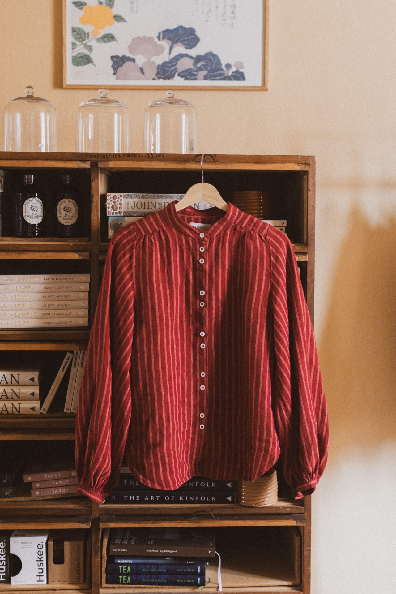 Linneblus med klassisk ståkrage i en randig väv. Välskräddad över rygg och axlar och med vacker vidd i ärmen, vilket ger blusen extra rörelsevidd.